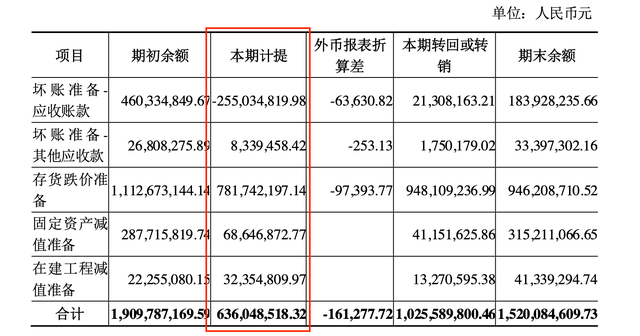 据此前公告显示,公司2021年累计计提各项减值准备约6.36亿元,其中主要为存货跌价准备,计提金额约7.82亿元。