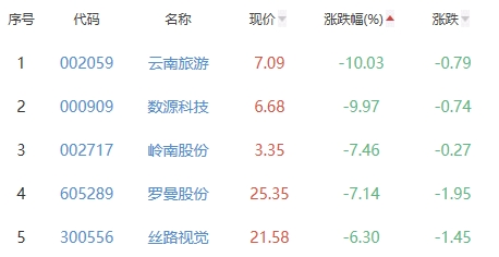 云南旅游、数源科技、岭南股份、罗曼股份、丝路视觉位列涨幅榜后五位,涨幅分别为-10.03%、-9.97%、-7.46%、-7.14%、-6.30%。