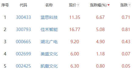 其中,蓝思科技、佳禾智能、湖北广电、美盛文化、凯撒文化位列板块涨幅前五位,涨幅分别为6.67%、5.08%、4.90%、1.18%、0.80%。