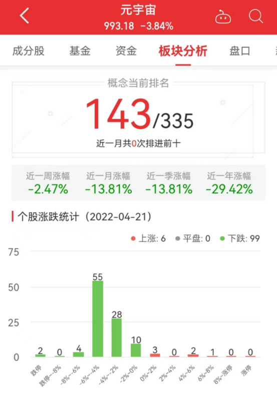 中国经济网北京4月21日讯今日,元宇宙板块整体跌幅3.84%,其中6只股票上涨,99只股票下跌。