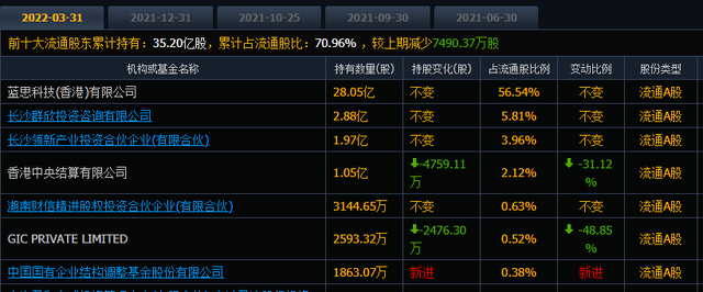 在2021年10月25日蓝思科技显示的前十大流通股东数据中,彼时前十大流通股东累计持有36.33亿股,较上期减少3234.34万股。这一数值在2021年末减至35.94亿股,在2022年一季度末减至35.20亿股。