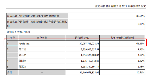 更令投资者担忧的是,蓝思科技高度依赖大客户。从2018年至2021年,对苹果公司销售额占总销售比例从46.97%增长至66.49%。从去年开始,市场多次网传苹果砍单,而当传闻出现后,对蓝色科技股价有所冲击。