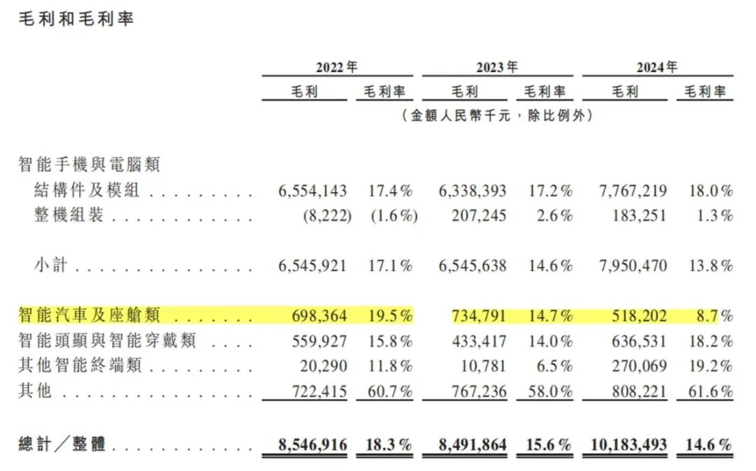 与此同时,业务的毛利率却开始“失速”;2022年-2024年智能汽车及座舱类业务毛利率分别为19.5%、14.7%、8.7%。