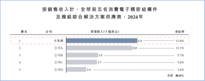 2024年,蓝思科技在全球消费电子精密结构件及模组综合解决方案市场份额约为13.0%,排名全球第一。