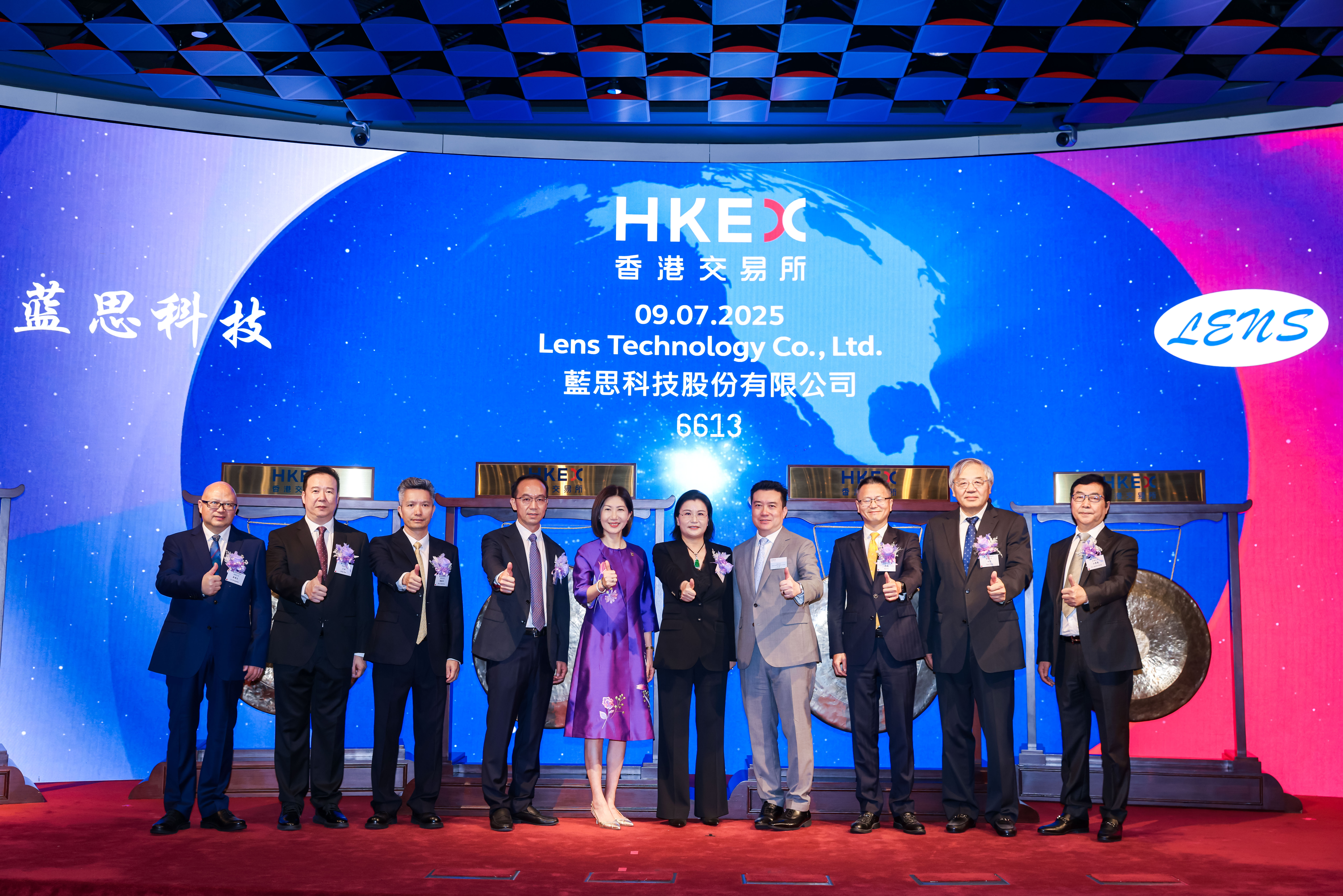 香港联交所交易大厅内,蓝思科技创始人及董事长周群飞手持木槌敲响上市铜锣,宣告公司正式登陆港交所主板。