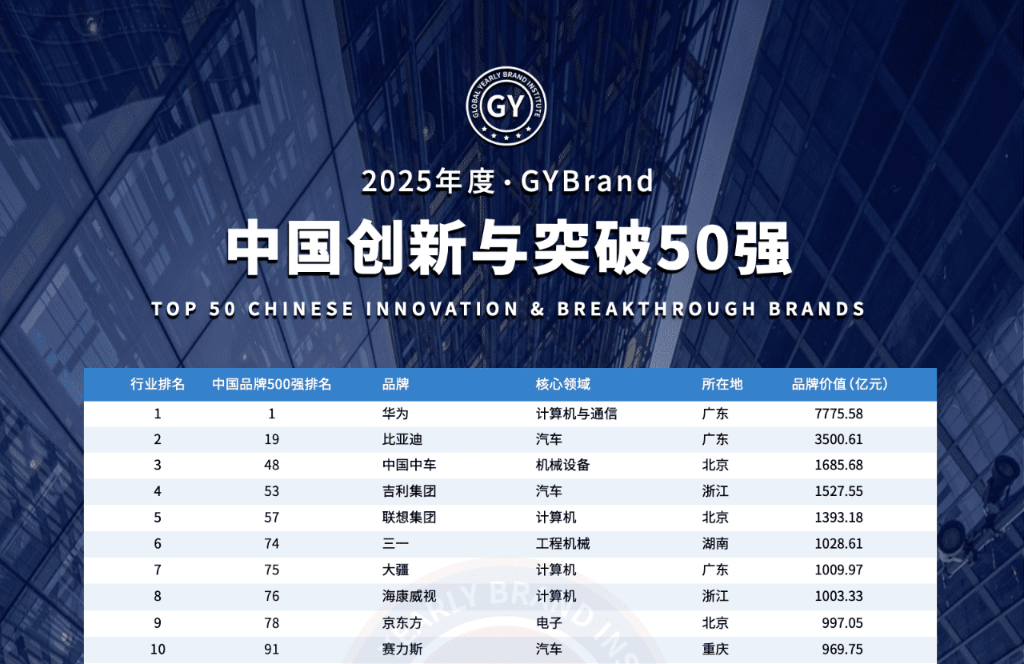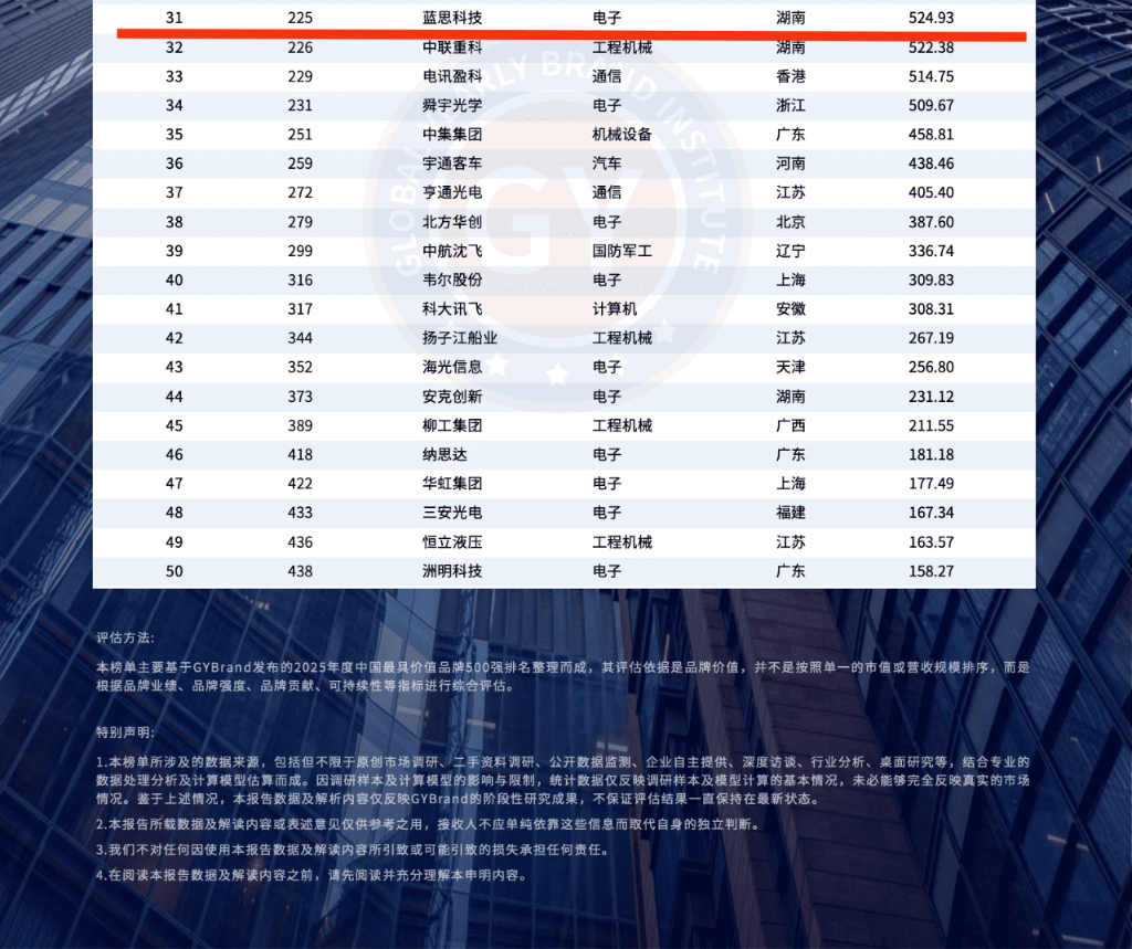 近日,全球品牌评估机构GYBrand发布“2025中国创新与突破50强”榜单,蓝思科技凭借在创新研发与智能制造领域的突破性成果成功入选。该榜单基于品牌价值、创新力、可持续发展等维度综合评定,呈现中国科技企业的创新生态。