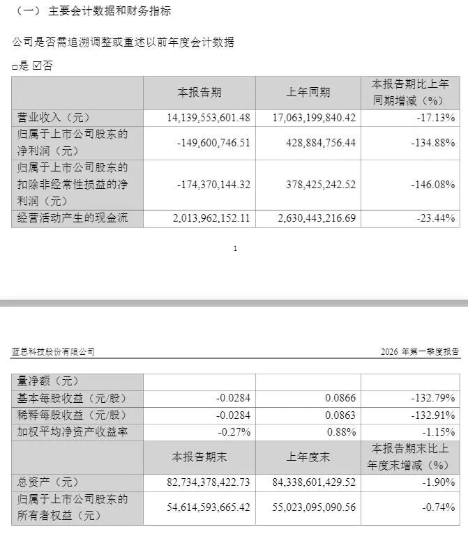 4月15日,蓝思科技披露2026年第一季度报告。