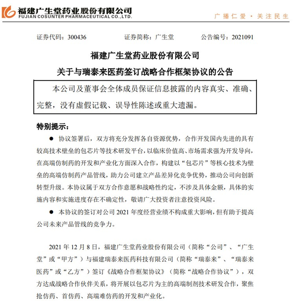 广生堂(300436)公告,公司与福建瑞泰来医药科技有限公司签订《战略合作框架协议》,双方共同建立并不断深化战略合作伙伴关系,积极致力于抢仿药、首仿药以及以包芯片、口溶膜、骨架缓控释等技术平台为核心技术壁垒的高端仿制药的开发和产业化合作。