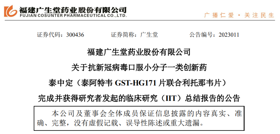 1月9日,广生堂发布公告,称研究者发起的评估其3CL蛋白酶抑制剂GST-HG171(泰阿特韦)联合利托那韦(合称“泰中定”)治疗新冠患者有效性与安全性的临床试验(IIT),现已完成全部受试者入组和临床观察,并于近日取得临床研究总结报告。