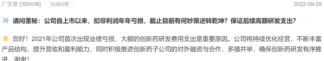 在互动易平台上,广生堂回复投资者为何2021年首次出现亏损,理由是大额的创新药研发费用支出是重要原因。