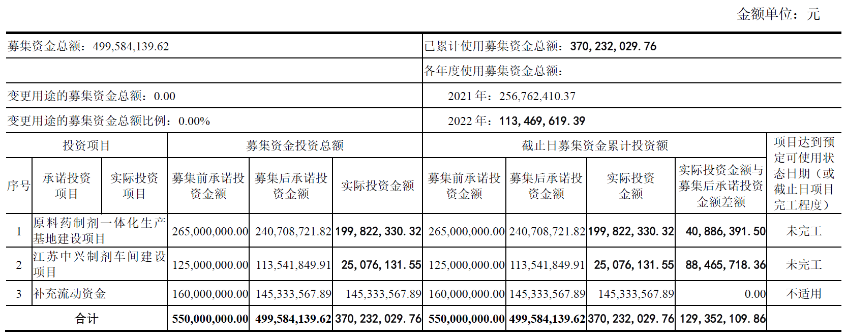 广生堂此前在2021年6月向特定对象发行人民币普通股1877.70万股,每股发行价格为27.40元,共募集资金514,489,800.00元,扣除相关的发行费用14,905,660.38元,实际募集资金499,584,139.62元,用于原料药制剂一体化生产基地建设项目、江苏中兴制剂车间建设项目、补充流动资金。