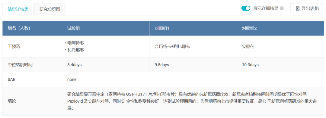 2023 年 1 月,广生堂公布了 GST-HG171(泰阿特韦)联合利托那韦(合称「泰中定」)的 IIT 试验的积极结果,表现出新冠患者核酸转阴时间优于阳性对照 Paxlovid 及安慰剂对照的趋势,且安全性和耐受性良好。