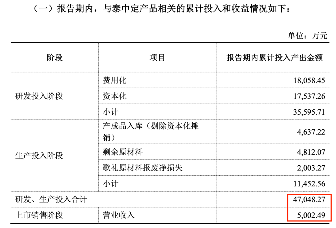 公司在定增问询文件中披露,截至2025年3月末,公司为泰中定产品上市累计投入4.7亿元,其中研发投入约3.56亿元、生产投入约1.15亿元,而泰中定产品上市后的累计收入仅为5002.49万元。
