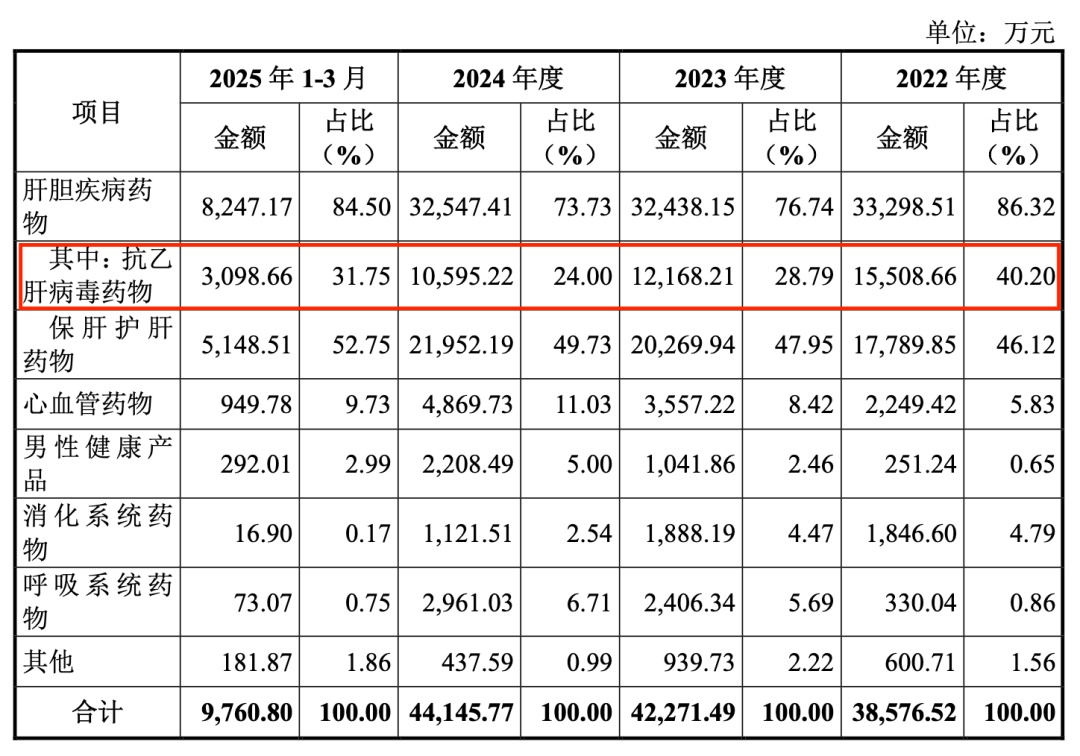 第二,是受国家药品集中采购等政策持续影响,公司抗乙肝病毒药物收入持续下降。报告期内,广生堂的抗乙肝病毒药物实现收入分别为1.55亿元、1.22亿元、1.06亿元及3098.66万元,占同期营业总收入的比例分别为40.2%、28.79%、24%及31.75%。