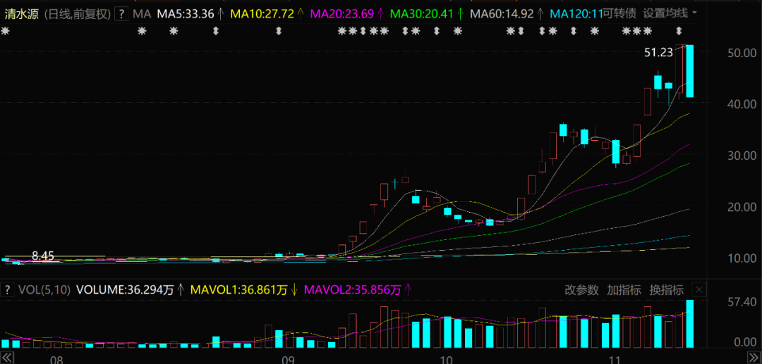 在9月9日第一个20cm涨停之前,清水源的股价只有10元左右,到了11月10日收盘涨停,清水源股价已经飙升到了51元以上,两个月涨幅高达400%!