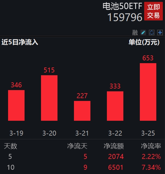 从资金净流入方面来看,电池50ETF近8天获得连续资金净流入,最高单日获得1146.44万元净流入,合计“吸金”5012.94万元,日均净流入达626.62万元。