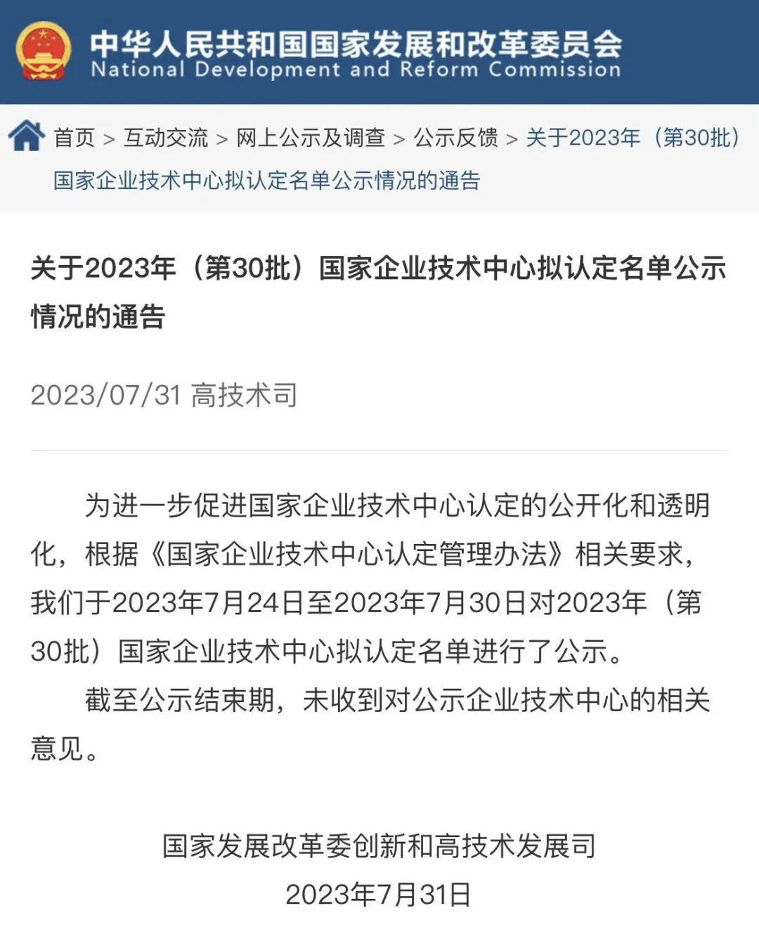 国家级企业技术中心是国家发改委、科技部、财政部、海关总署、国家税务总局五部委联合授予的规格高、影响力大的技术创新平台之一,是我国企业技术中心评定的最高等级,是企业开展技术研发与创新、承担国家重大技术创新任务和科技成果转化的重要平台。其评审认定门槛高、程序严格、行业竞争激烈,仅对创新能力强、创新机制好、引领示范作用大、符合条件的企业技术中心予以认定,具有很高的含金量。