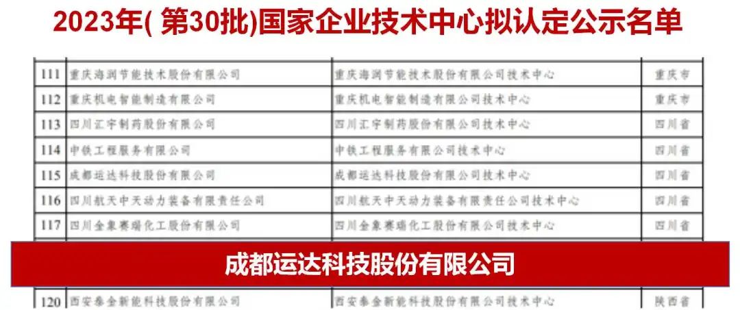 近日,国家发改委、科技部、财政部、海关总署、税务总局等五部委联合印发通知,公布了2023年(第30批)国家企业技术中心拟认定名单,成都运达科技股份有限公司(股票代码:300440)荣耀入选。这一荣誉不仅是对运达科技研发实力的肯定,也是对公司未来发展的期许。