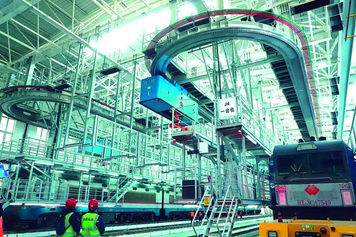 机车驶入检测棚,运行、检测数据自动下载,回传至集控中心进行分析;集控中心自动下发机器人作业任务,车顶机器人向车顶两端进发,车底机器人驶入车底及机车两侧,机械手臂忙碌地上下挥舞,扫描是否存在异常,并进行绝缘子清洗等工作……每天,国家能源集团新朔铁路的机车结束值乘任务后,都要经历这样的“体检”整备,以确保安全、高效运行。