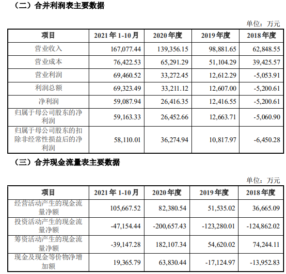 2018年-2020年及2021年1-10月,润泽科技营业收入分别为62,848.55万元、98,881.65万元、139,356.15万元、167,077.44万元,归属于母公司股东的净利润分别为-5,060.90万元、12,663.71万元、26,452.66万元、59,163.33万元,经营活动产生的现金流量净额分别为36,665.09万元、51,535.02万元、82,380.54万元、105,667.52万元。