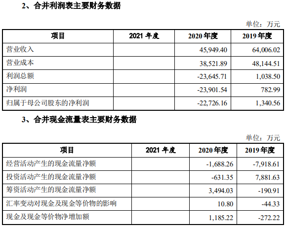 2019年、2020年,普丽盛营业收入分别为64,006.02万元、45,949.40万元;归属于母公司股东的净利润分别为1,340.56万元、-22,726.16万元;经营活动产生的现金流量净额分别为-7,918.61万元、-1,688.26万元。