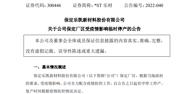 *ST乐材(300446)4月25日晚间公告,公司保定厂区,根据当地政府的要求,受疫情影响,公司全力配合疫情防控工作,自公告之日起有序停工停产。复产时间根据疫情防控情况决定。