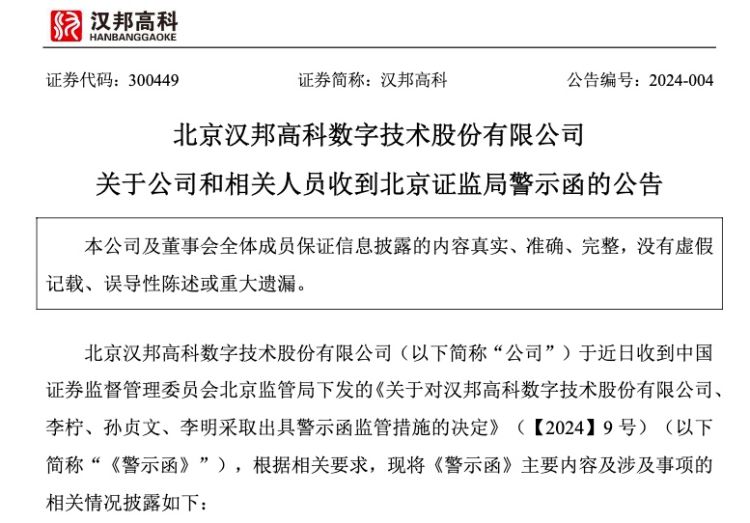 汉邦高科1月9日公告,公司于近日收到北京证监局下发的关于对公司、董事长李柠、总经理孙贞文、时任董事会秘书李明采取出具警示函监管措施的决定。