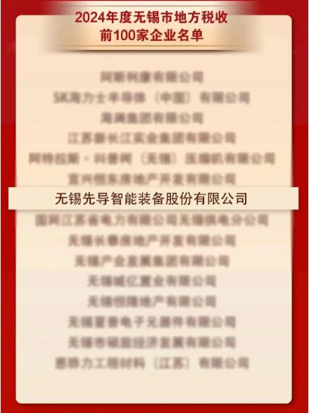 在当前复杂多变的社会经济环境中,企业不仅是经济发展的核心驱动力,更是社会财富积累的重要贡献者。依法纳税作为企业应尽的基本法律义务,不仅直接关系到国家财政收入的稳定增长,更深刻影响着社会的整体进步与民生福祉。近日,备受瞩目的 2024 年度无锡市纳税百强企业名单正式公布,这份榜单不仅是对企业过去一年经营成果的全面检验,更是无锡经济高质量发展态势的直观展现。在众多上榜企业中,先导智能凭借其卓越的经济贡献与社会责任践行成果,再次荣耀登榜,成为业界瞩目的焦点。