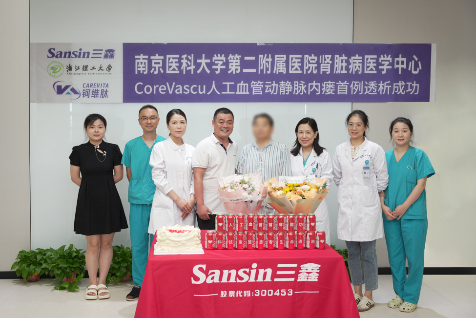 通过产学研医的深度合作,医工交叉深度融合,历经大量的基础研究,严苛的动物实验,三鑫医疗自主研发的首款国产ePTFE集成一体式CoreVascu人工血管正式进入多中心临床试验,首例患者在南京医科大学第二附属医院叶红主任团队的高效协作下顺利植入并圆满完成透析治疗。