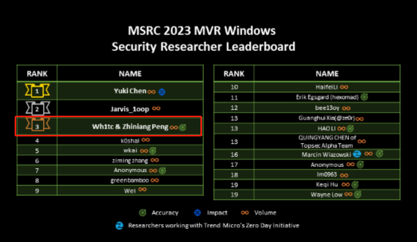 在4个专属领域的最具价值安全研究员榜单中,来自深信服Deepin Lab(深益研究实验室)的安全研究员wh1tc Zhiniang Peng在Windows操作系统领域斩获殊荣,荣登榜单第三。