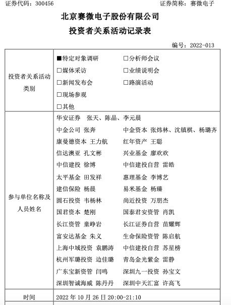 10月27日,北京赛微电子股份有限公司(以下简称“赛微电子”或“公司”)发布公告。公告称,公司于10月26日接受了华安证券、中金公司、康曼德资本等机构投资者的特定对象调研。