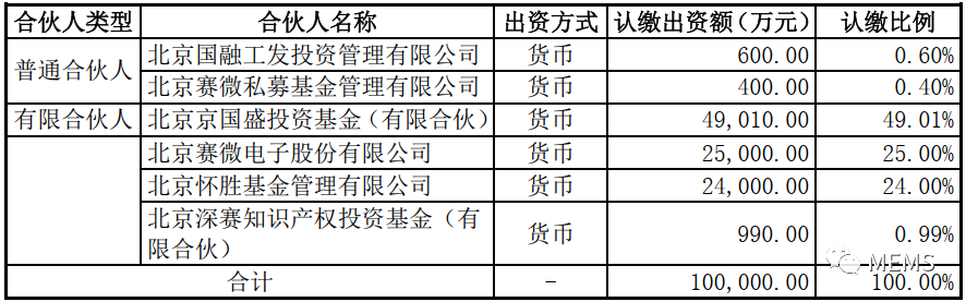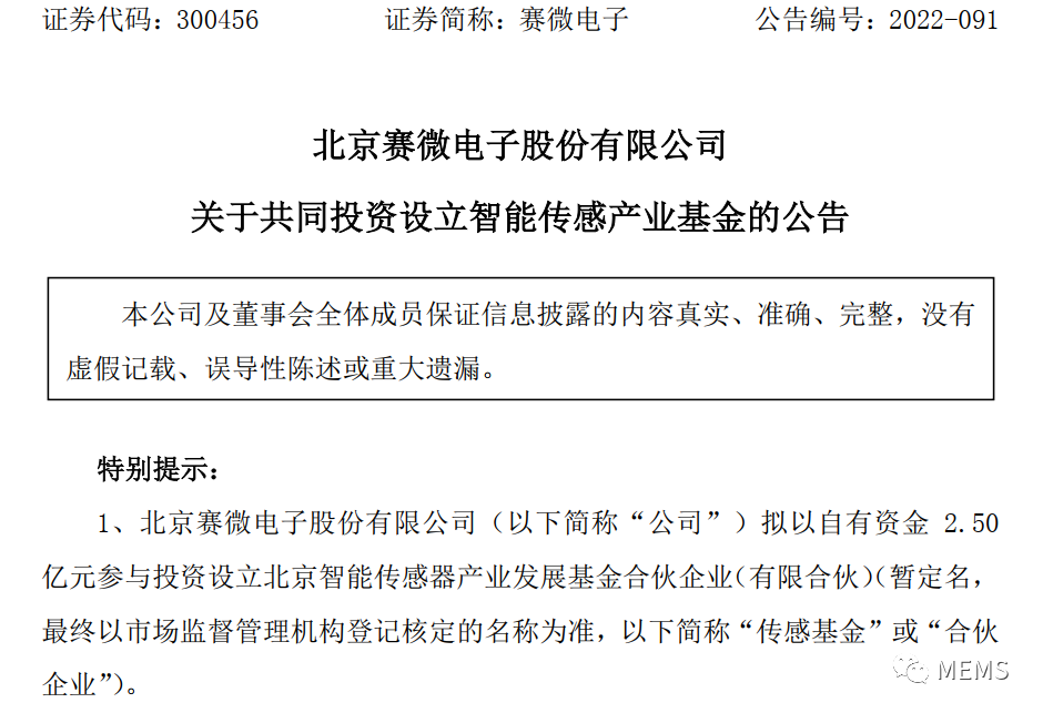 据麦姆斯咨询报道,近日,北京赛微电子股份有限公司(简称:赛微电子)发布公告:公司拟以自有资金2.50亿元参与投资设立北京智能传感器产业发展基金合伙企业(有限合伙)(暂定名,最终以市场监督管理机构登记核定的名称为准),占合伙企业总认缴出资额的25.00%。该传感基金将主要投资于智能传感器、高端科学仪器及其上下游领域。