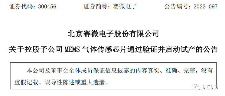 据麦姆斯咨询报道,近日,北京赛微电子股份有限公司(以下简称“赛微电子”)控股子公司赛莱克斯微系统科技(北京)有限公司(简称“赛莱克斯北京”)代工制造的某款MEMS气体传感芯片通过了客户验证,该客户已同步签署试产订单,赛莱克斯北京启动首批MEMS气体传感芯片8英寸晶圆的小批量试生产。