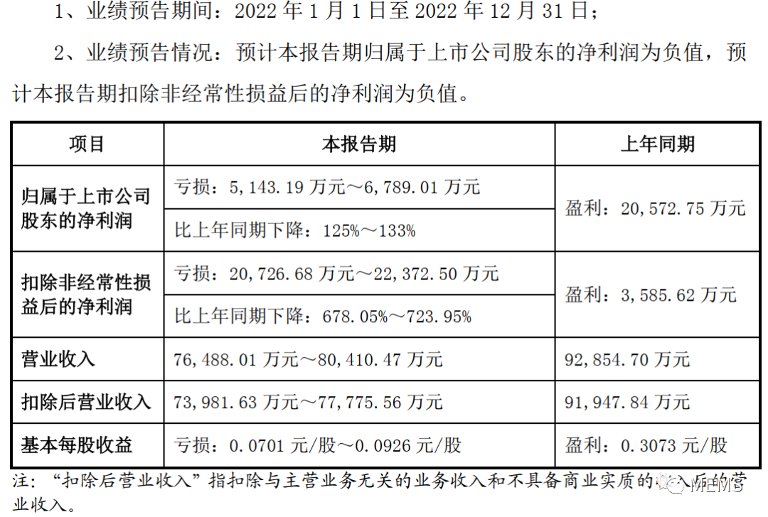 近日,北京赛微电子股份有限公司(简称:赛微电子)发布2022年年度业绩预告:本报告期归属于上市公司股东的净利润为负值——亏损:5,143.19万元~6,789.01万元,比上年同期下降:125%~133%;扣除非经常性损益后的净利润也为负值——亏损:20,726.68 万元~22,372.50 万元,比上年同期下降:678.05%~723.95%。