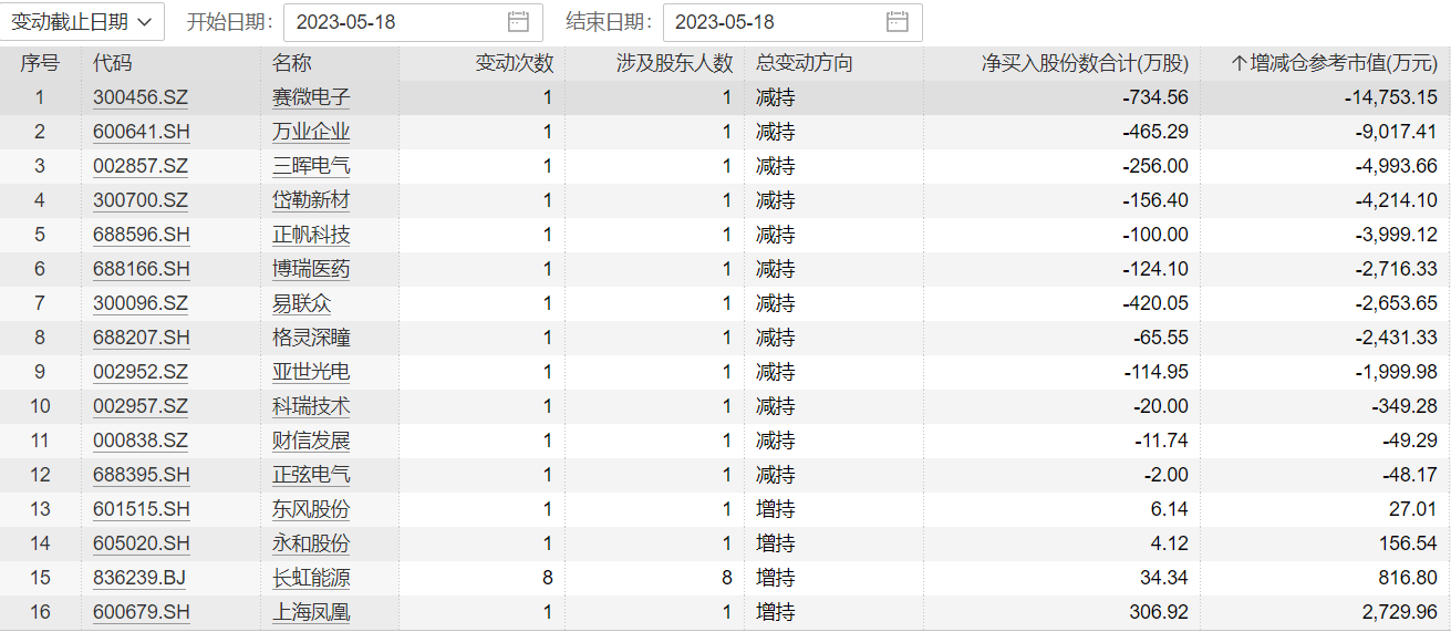 数据显示,按变动截止日期为基准,5月18日,4家上市公司股票获重要股东增持,上海凤凰重要股东共计增持306.92万股,增持金额为2729.96万元。12股遭重要股东减持,赛微电子遭重要股东减持734.56万股,减持金额最高,为1.48亿元。(一财)