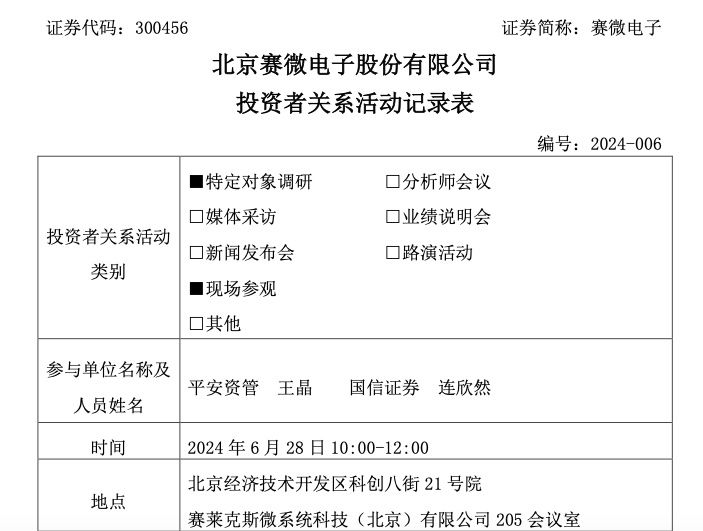 北京赛微电子股份有限公司(证券代码:300456;证券简称:赛微电子)6月28日发布投资者关系活动记录表,公司于近日举行特定对象调研和现场参观。调研中,塞微电子介绍了公司的基本情况、发展历程、核心业务、产业角色、全球化布局、发展战略、商业模式、竞争格局等。在经历重大战略转型后,赛微电子表示,已专注MEMS芯片制造主业,当前核心工作就是持续提升境内外产线的产能、利用率及良率,公司看好智能传感行业的未来发展空间,同时对自身的芯片制造工艺及综合竞争实力充满信心。