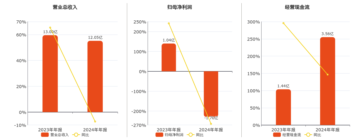 公司营业总收入为12.05亿元,较去年同报告期营业总收入减少9496.70万元,同比较去年同期下降7.31%。归母净利润为-1.70亿元,较去年同报告期归母净利润减少2.74亿元,同比较去年同期下降264.07%。经营活动现金净流入为3.56亿元。