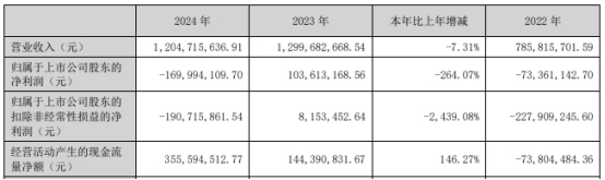赛微电子昨晚披露的2024年年度报告显示,公司2024实现营业收入12.05亿元,同比下降7.31%;归属于上市公司股东的净利润-1.70亿元,上年同期为1.04亿元;归属于上市公司股东的扣除非经常性损益的净利润-1.91亿元,上年同期为815.35万元;经营活动产生的现金流量净额为3.56亿元,同比增长146.27%。