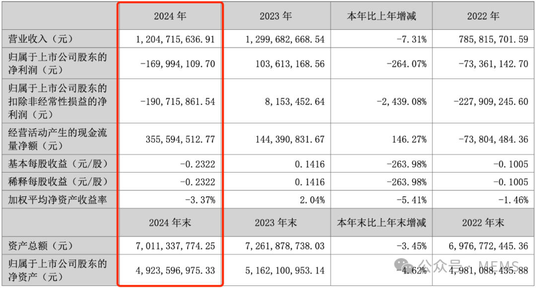 2024年,赛微电子实现营业收入12.05亿元,较上年下降7.31%;利润科目由盈转亏,其中,营业利润-2.54亿元,较上年大幅下降901.90%;利润总额-2.54亿元,较上年大幅下降900.76%;净利润-2.55亿元,较上年大幅下降454.28%;归属于上市公司股东的净利润-1.70亿元,较上年大幅下降264.07%;归属于上市公司股东的扣除非经常性损益的净利润-1.91亿元,较上年大幅下降2439.08%。