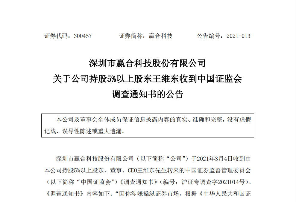 自3月4日,公司持股5%以上股东、董事、CEO王维东先生因涉嫌操纵证券市场,被证监会立案调查。因王维东先生因涉嫌操纵证券、期货市场罪,于2021年1月15日被公安机关采取刑事拘留。目前还未调查结束,赢合科技尚未收到中国证监会就上述立案调查事项的结论性意见或决定。