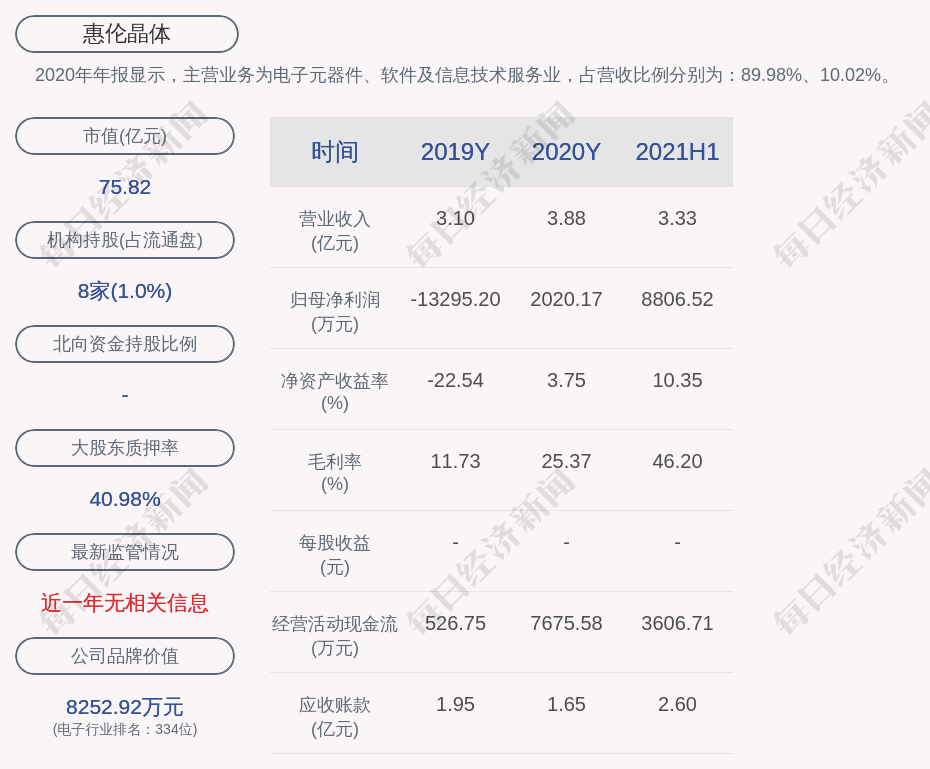2020年年报显示,惠伦晶体的主营业务为电子元器件、软件及信息技术服务业,占营收比例分别为:89.98%、10.02%。