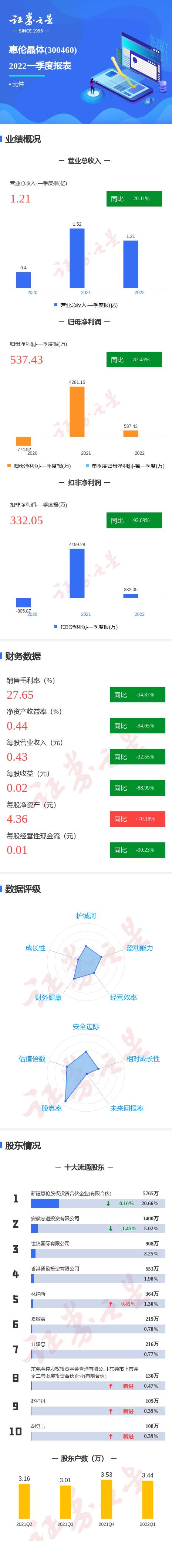 惠伦晶体2022一季报显示,公司主营收入1.22亿元,同比下降20.11%;归母净利润537.43万元,同比下降87.45%;扣非净利润332.05万元,同比下降92.09%;其中2022年第一季度,公司单季度主营收入1.22亿元,同比下降20.11%;单季度归母净利润537.43万元,同比下降87.45%;单季度扣非净利润332.05万元,同比下降92.09%;负债率40.41%,投资收益-14.94万元,财务费用160.57万元,毛利率27.65%。