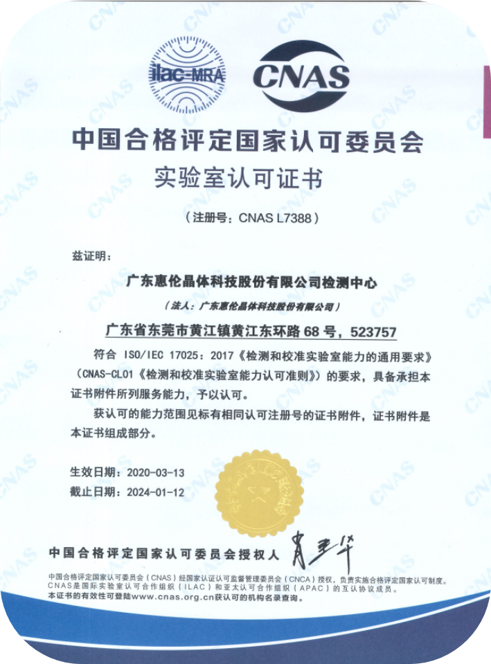 惠伦晶体作为晶振行业的前驱,沉淀30年高速发展,是目前国内一家独立拥有CNAS认证实验室的企业,拥有独立车间,专人专线管理,IT化系统。目前,Y和K系列的全部都通过了AECQ200认证,L系列的全部都通过了AECQ100认证。