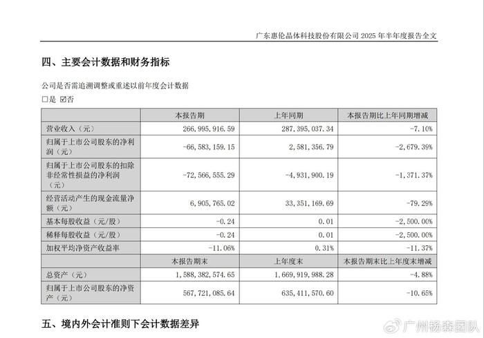 2025年8月29日,惠伦晶体300460披露2025年半年度报告,营业总收入2.67亿元,比上年同期下降7.10%,归属于上市公司股东的净利润-6658.32万元,比上年同期下降2679.39%。