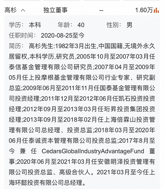 公开资料显示,高杉出生于1982年,毕业于山东轻工业学院,2005年以来曾任职泰信基金、上投摩根基金、国泰基金、凯石投资等多家知名投资机构。目前是上海环懿投资有限公司(简称“环懿投资”)总经理。2020年10月,高杉获得环懿投资100%股权,成为环懿投资实际控制人。环懿投资现用名“上海环懿私募基金管理有限公司”,公开信息显示,2022年1月前,环懿投资的资产管理规模近40亿元。