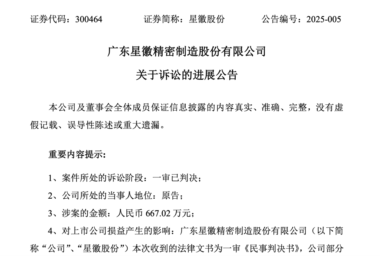 2024年深圳中院一审曾驳回星徽股份要求赔偿股权损失的全部诉讼请求。2025年2月11日星徽股份公告与孙才金等9名被告纠纷一审部分胜诉,被告需向泽宝技术支付667.02万元及利息,但后续进展及执行情况存在不确定性。
