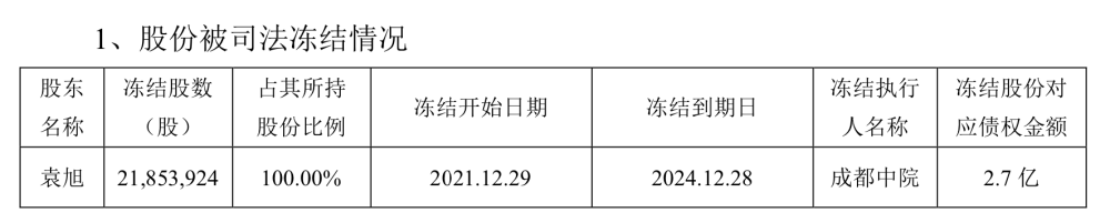 另外需要指出的是,袁旭目前的股份被100%司法冻结和轮候冻结,冻结执行人为成都中院。