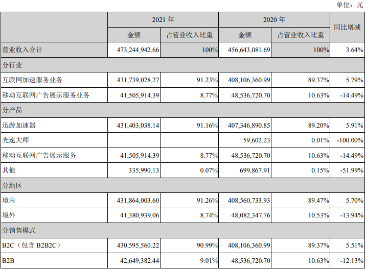 以2021年业绩为例,互联网加速服务业务占收入比重高达91.23%,其中迅游加速器产品为主要营收来源,占比高达91.16%。这意味着,迅游加速器承载了迅游科技几乎所有希望,一旦该业务发展受阻,会对业绩带来很大影响。