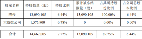 陈俊及其一致行动人大数据公司所持股份累计被冻结约1466.70万股,持股比例约7.22%。陈俊所持公司股份累计质押约1300.76万股,占其所持公司股份数量的99.37%,其中质押给国海证券的695.44万股,已逾期。