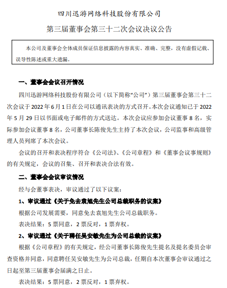 2022年6月2日,迅游科技发布公告称,经董事会表决,免去袁旭总裁职务。经董事长陈俊提名及提名委员会审查资格并同意,同意聘任吴安敏为总裁。